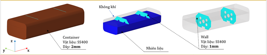 Chúng tôi tạo một mô hình bồn chứa với chất lỏng là nước, không khí, thành bể, vách ngăn, được xác định với các tính chất vật liệu phù hợp.